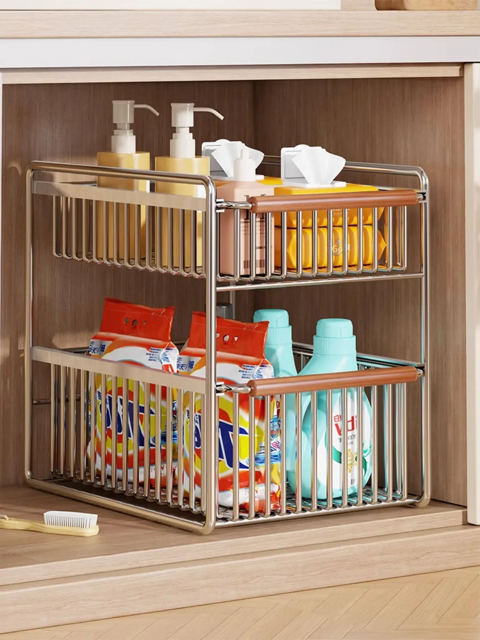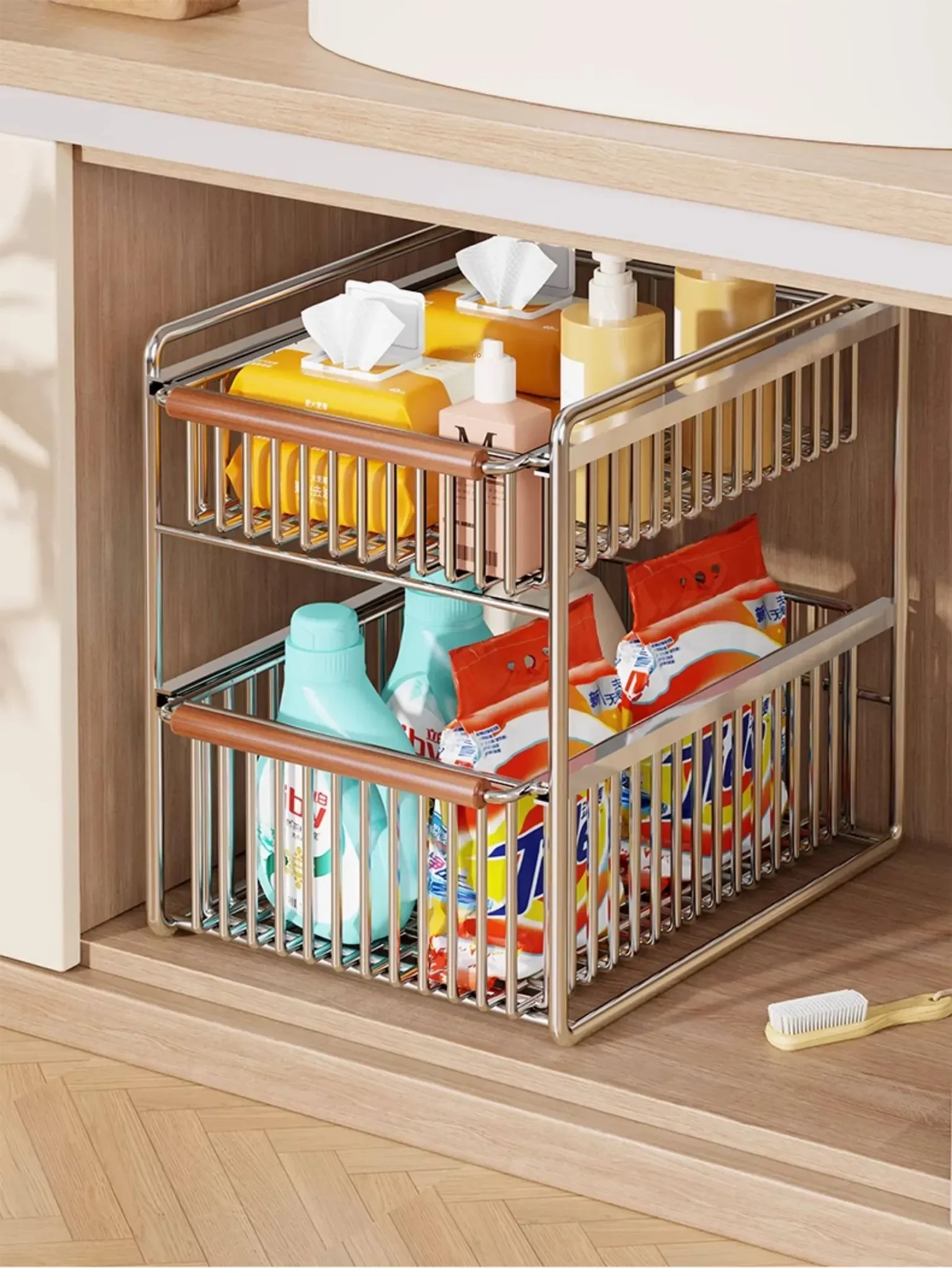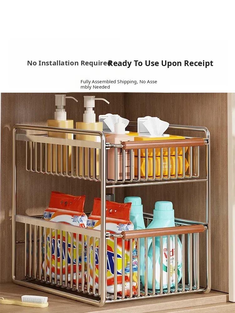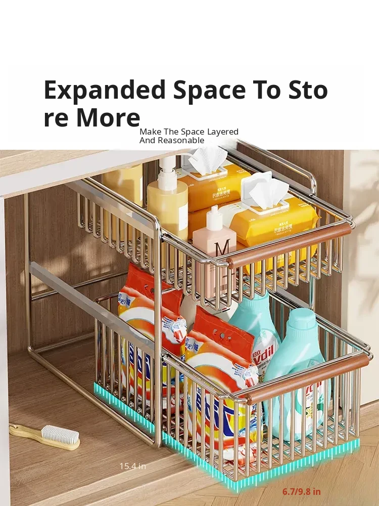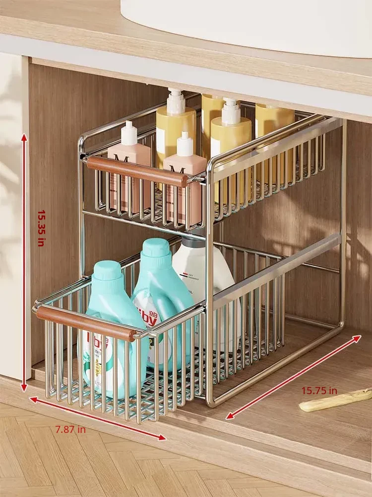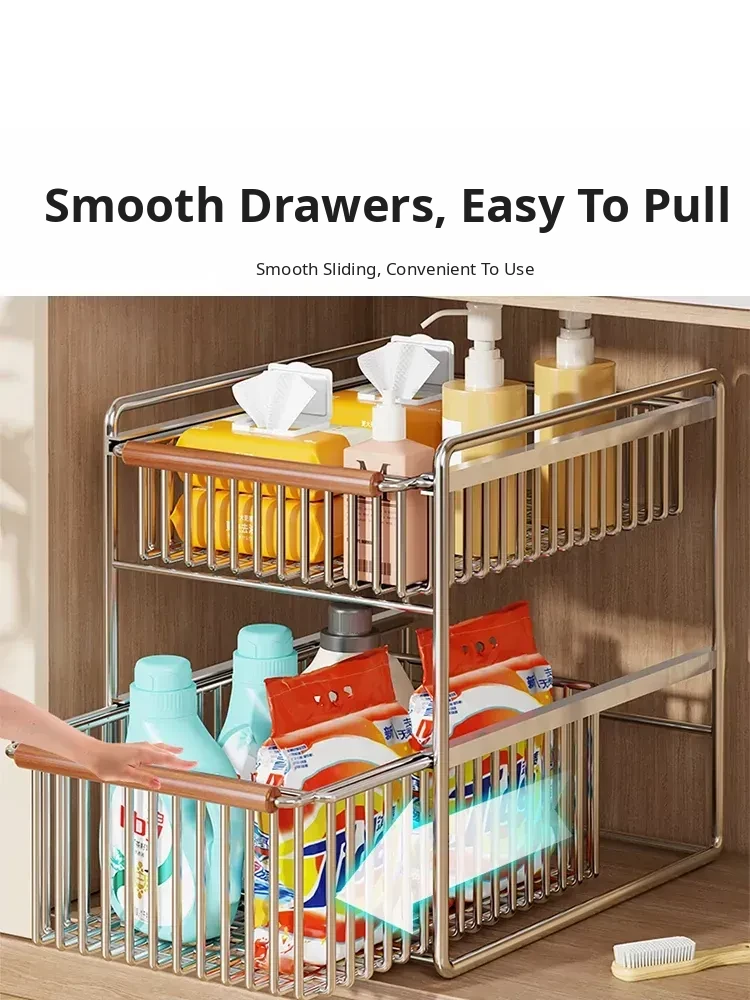 Multifunctional Double-Layer Pull-Out Kitchen Sink Organizer - Minimalist Spice Storage Rack for Tidy Bathroom Countertops