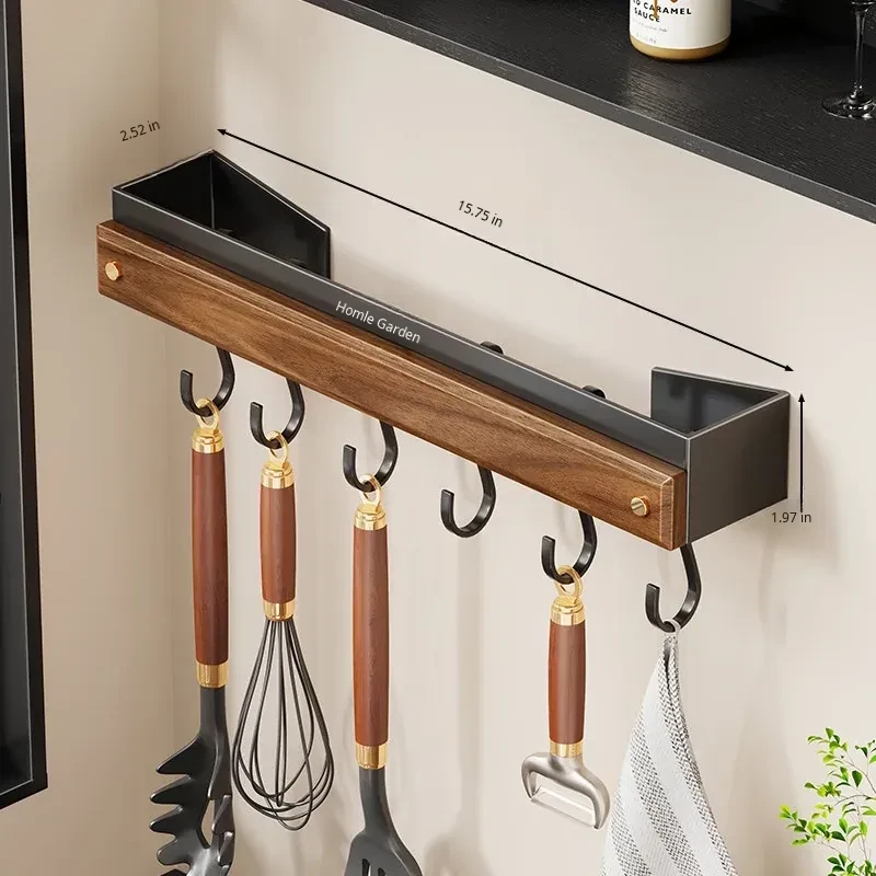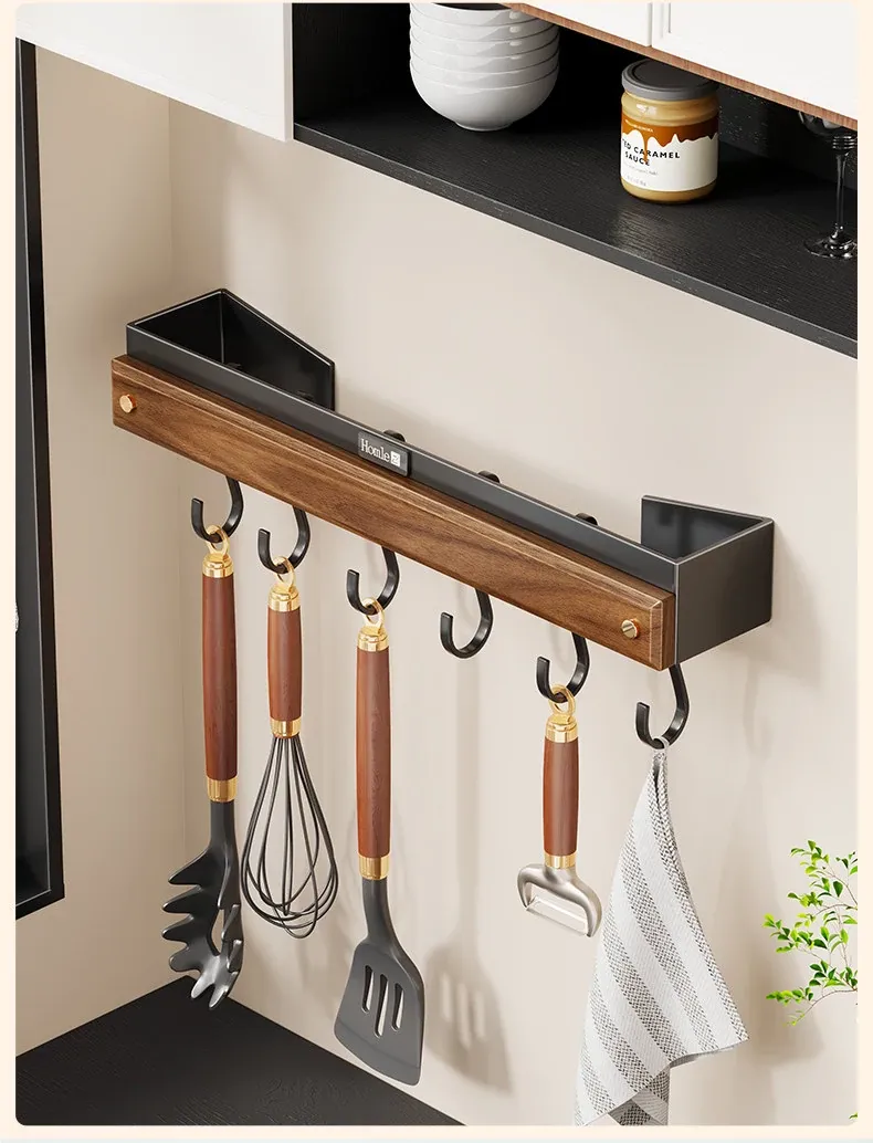 Solid Wood Kitchen Hook Rack - No Drill Wall-Mounted Storage Shelf for Pots, Spatulas, and Spoons - Perfect Organizer for Kitchen and Bathroom Utensils