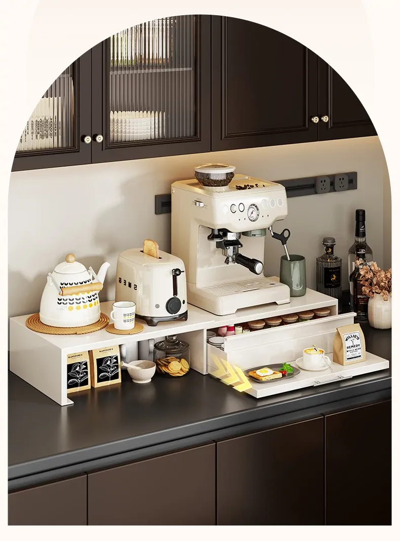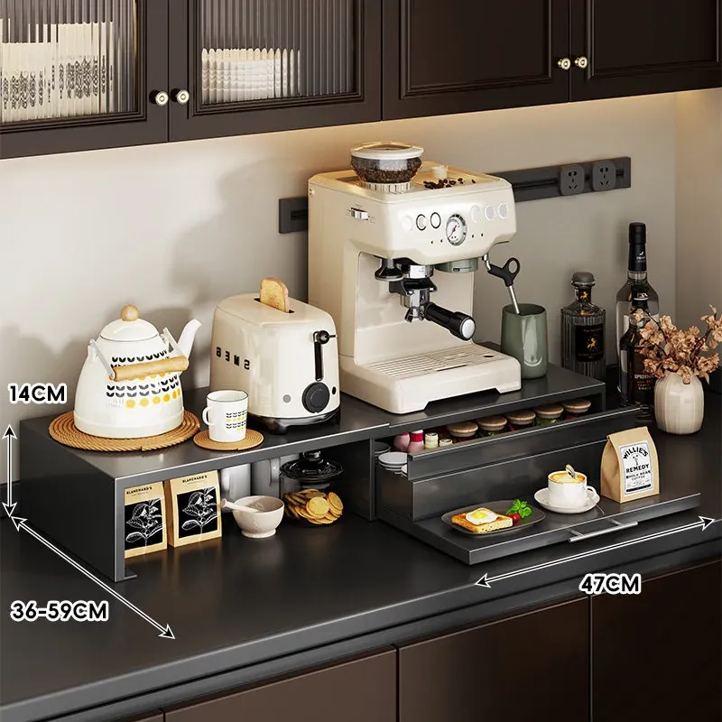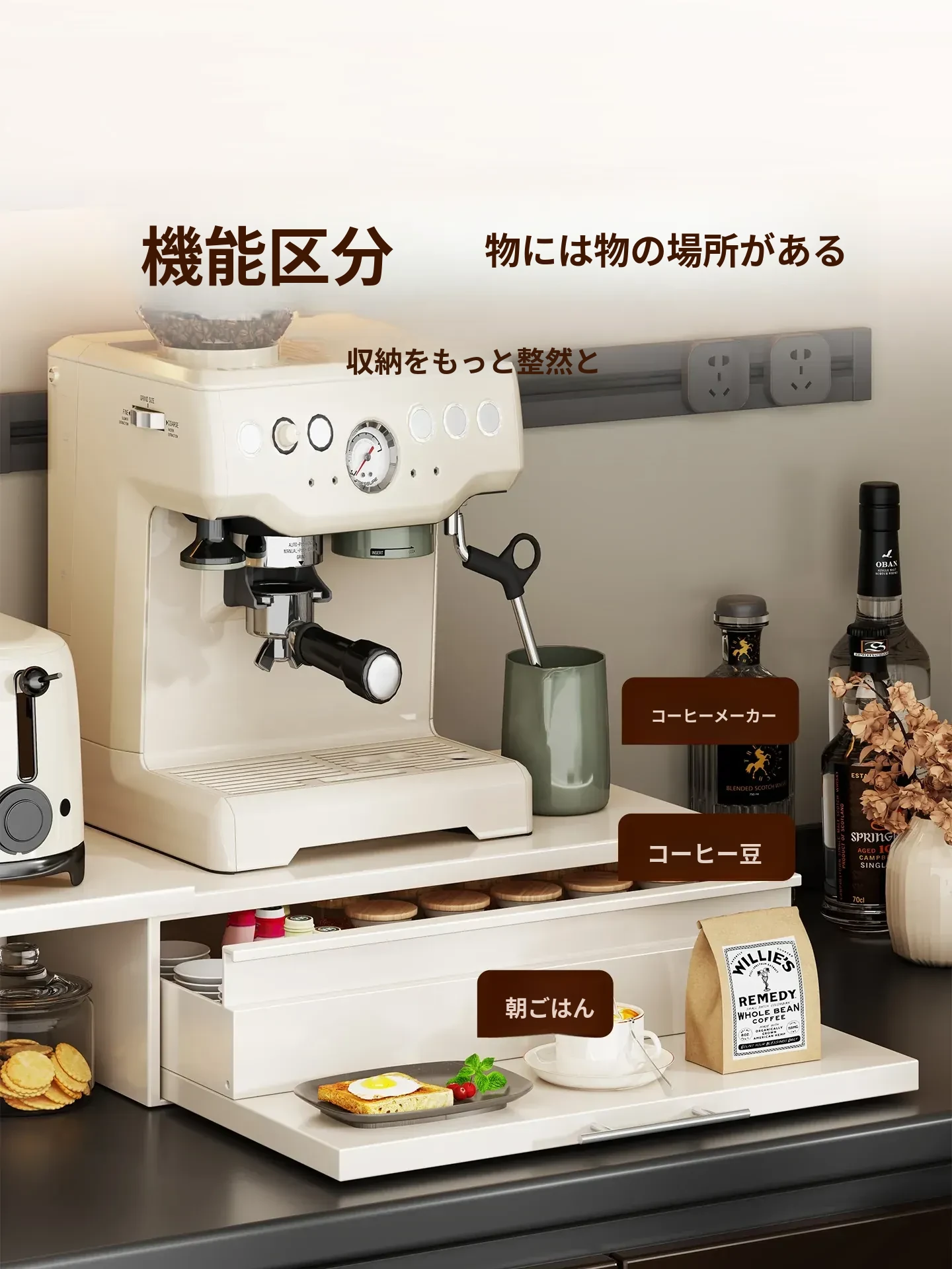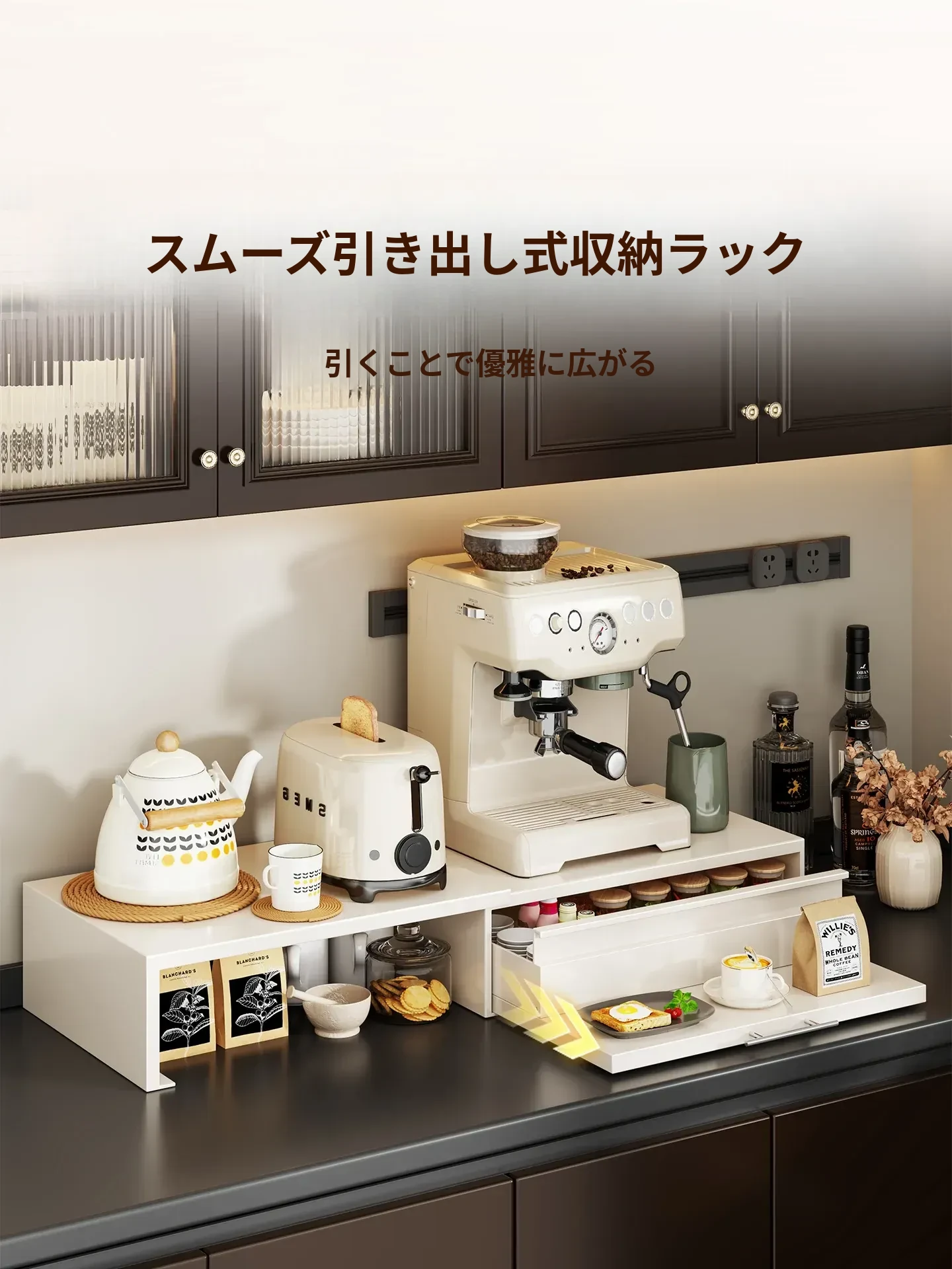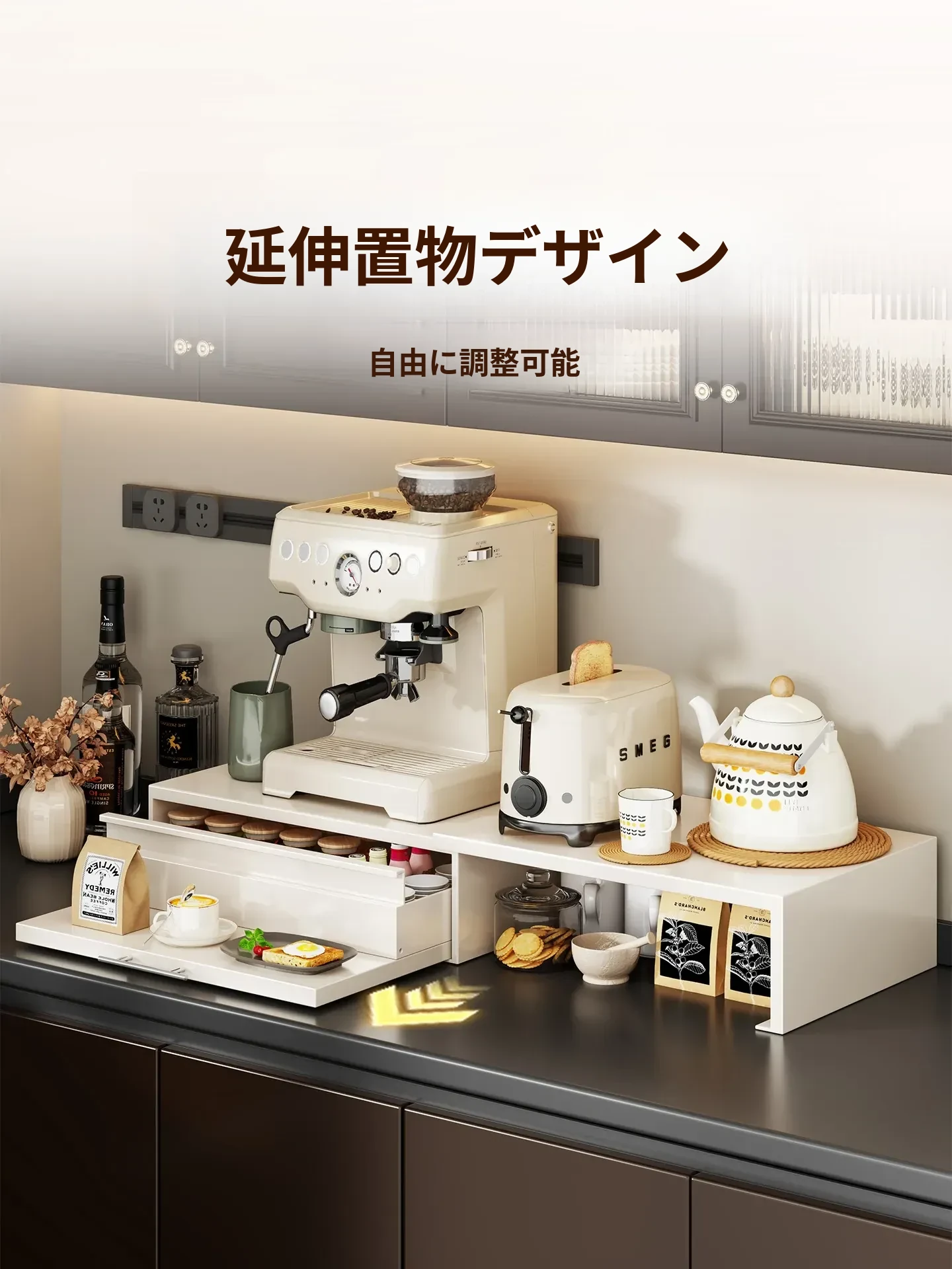 コーヒーメーカー用収納ラック - 調節可能な長さで、厚手で耐久性抜群!キッチンをすっきり整理し、電気ケトルも安心して置ける便利アイテム。あなたの料理空間をもっと快適に!