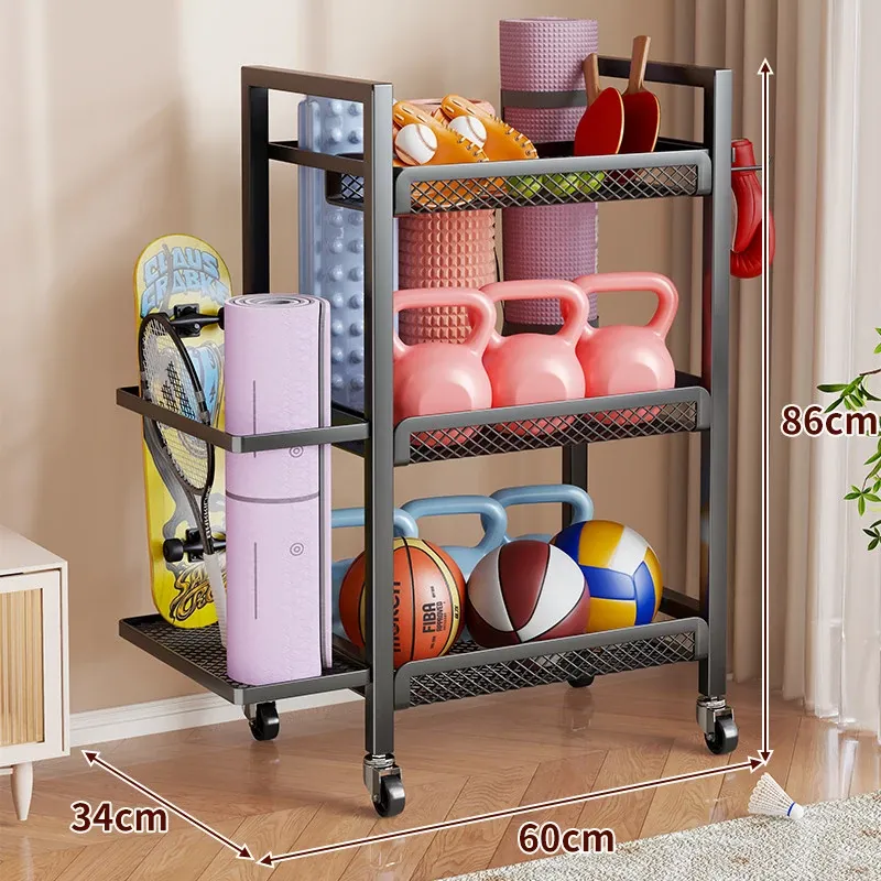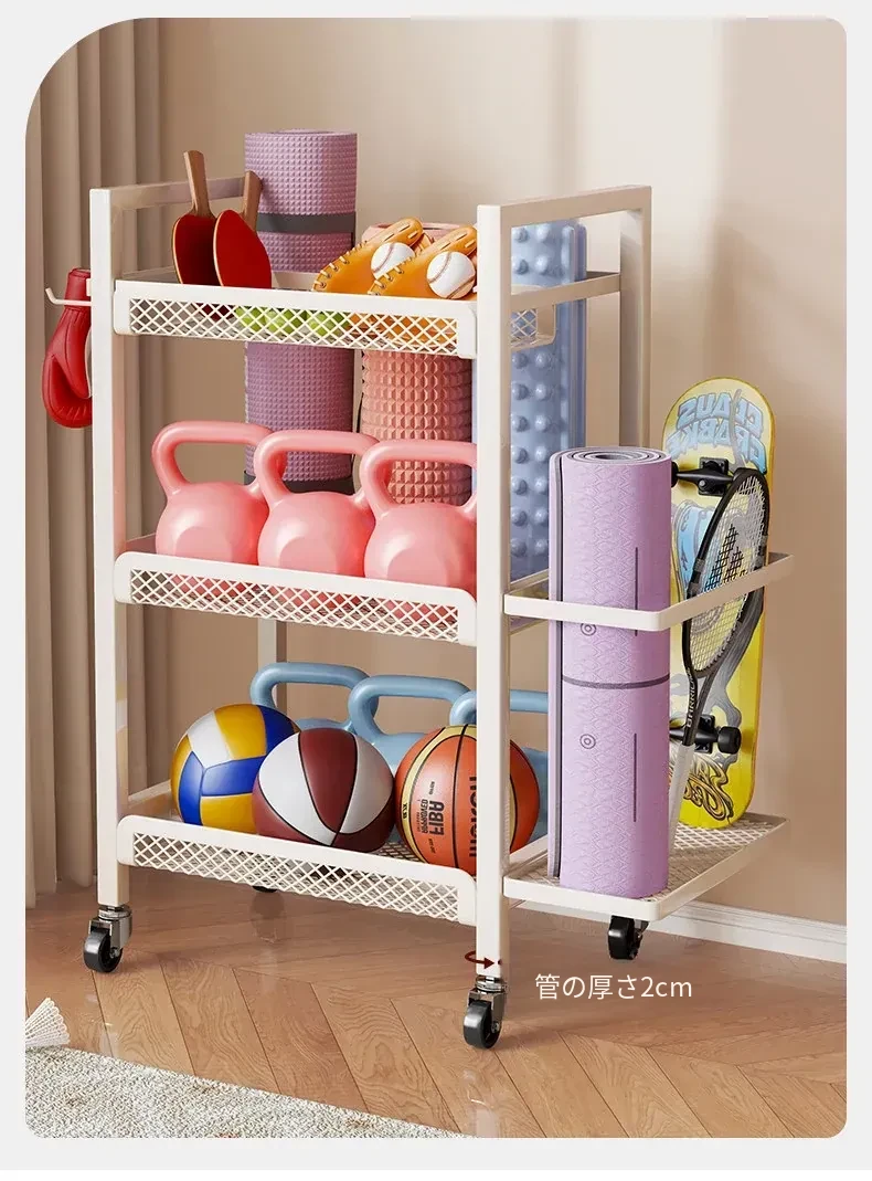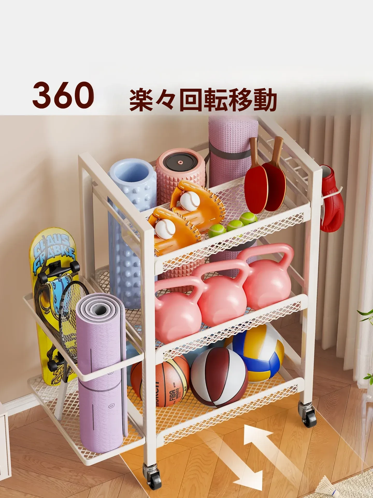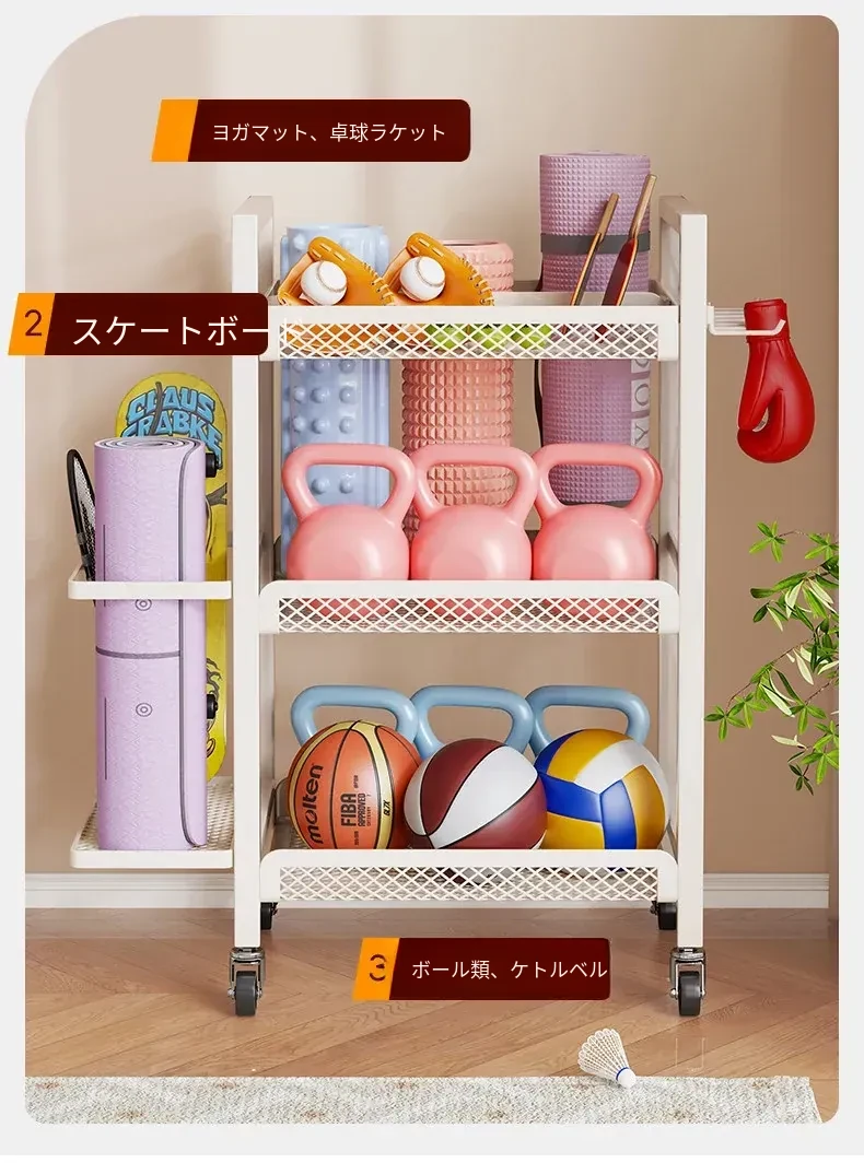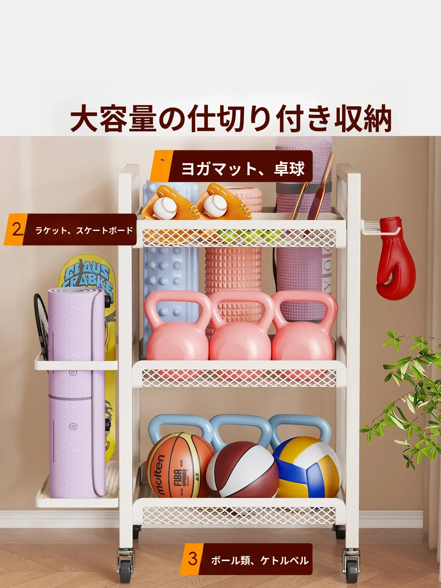 フィットネス器具収納ラック 大容量・移動可能!ヨガマット、ダンベル、ケトルベル、スポーツボールをすっきり整理。おしゃれで機能的なデザインで、お家の運動空間をもっと快適に!