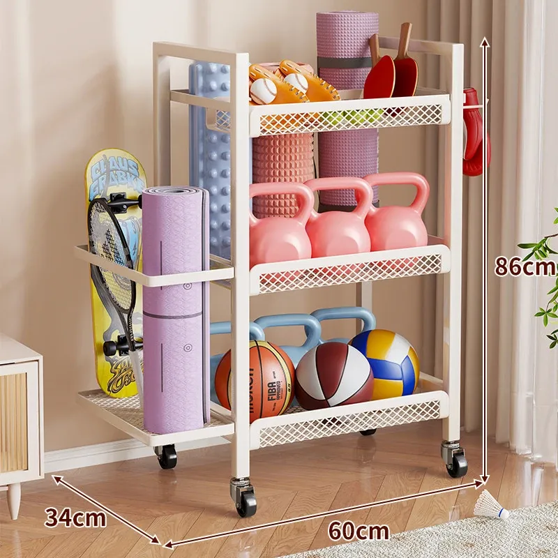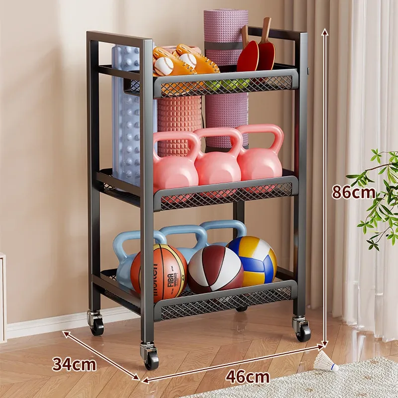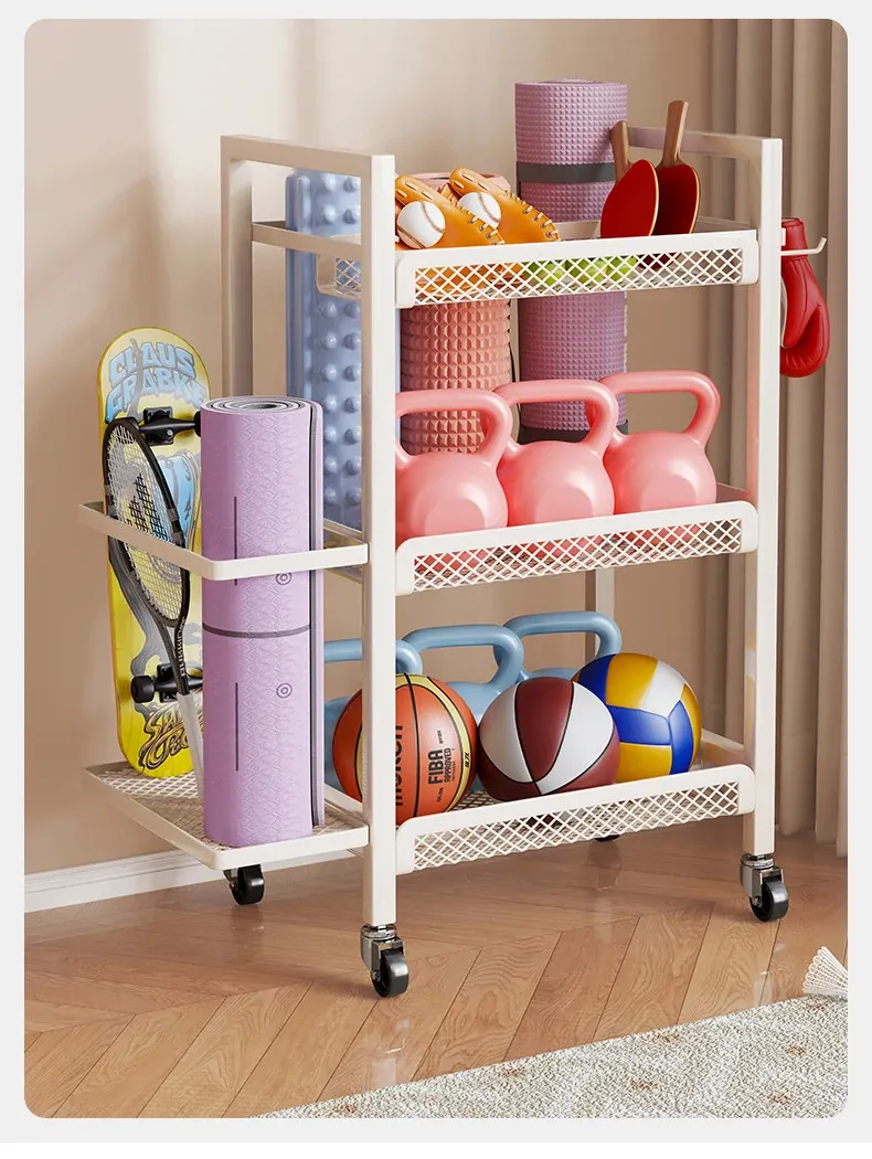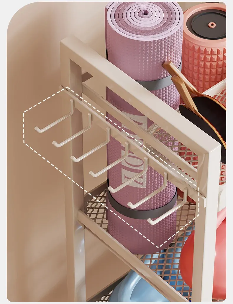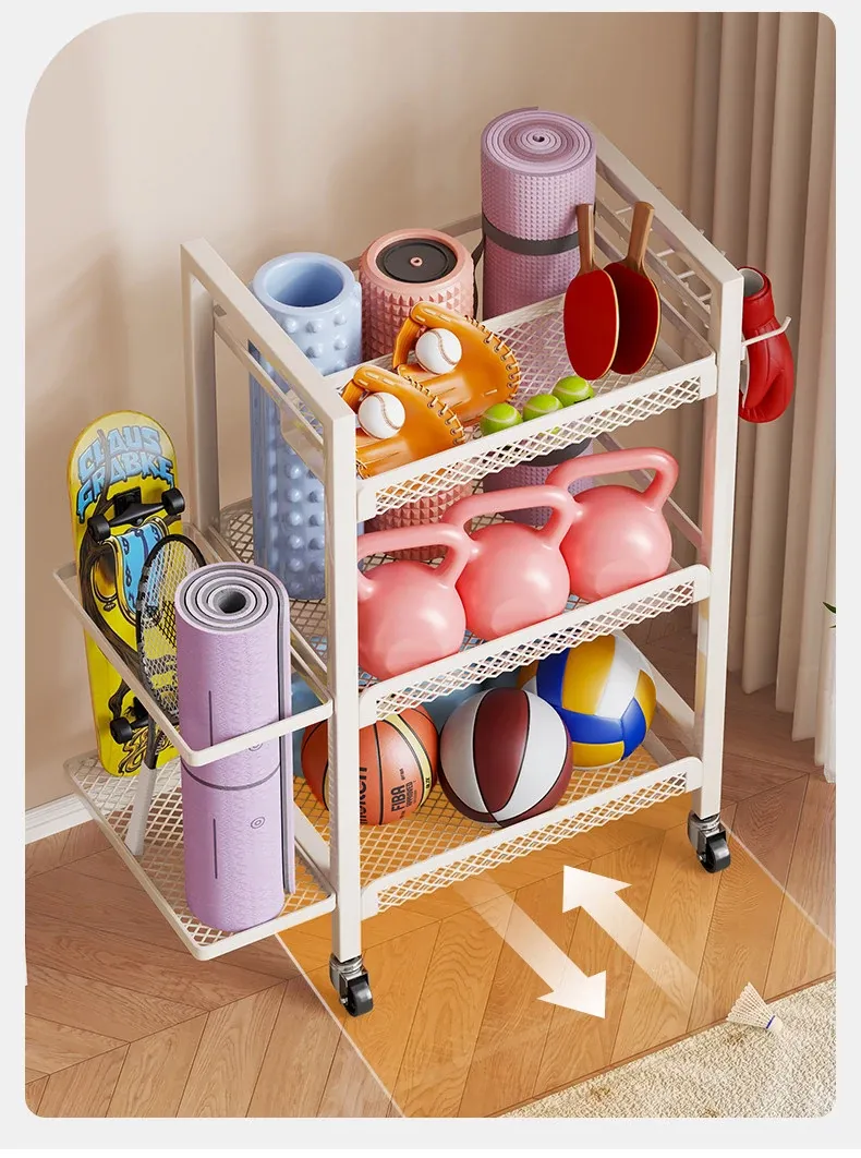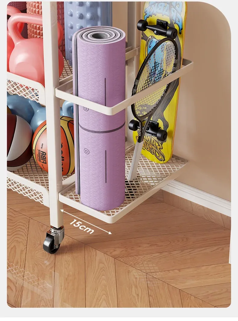 フィットネス器具収納ラック 大容量・移動可能!ヨガマット、ダンベル、ケトルベル、スポーツボールをすっきり整理。おしゃれで機能的なデザインで、お家の運動空間をもっと快適に!
