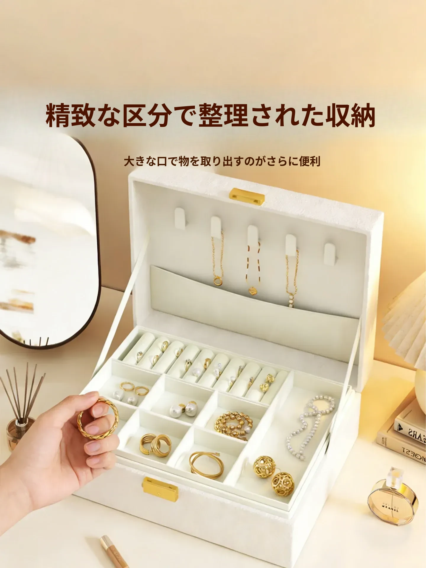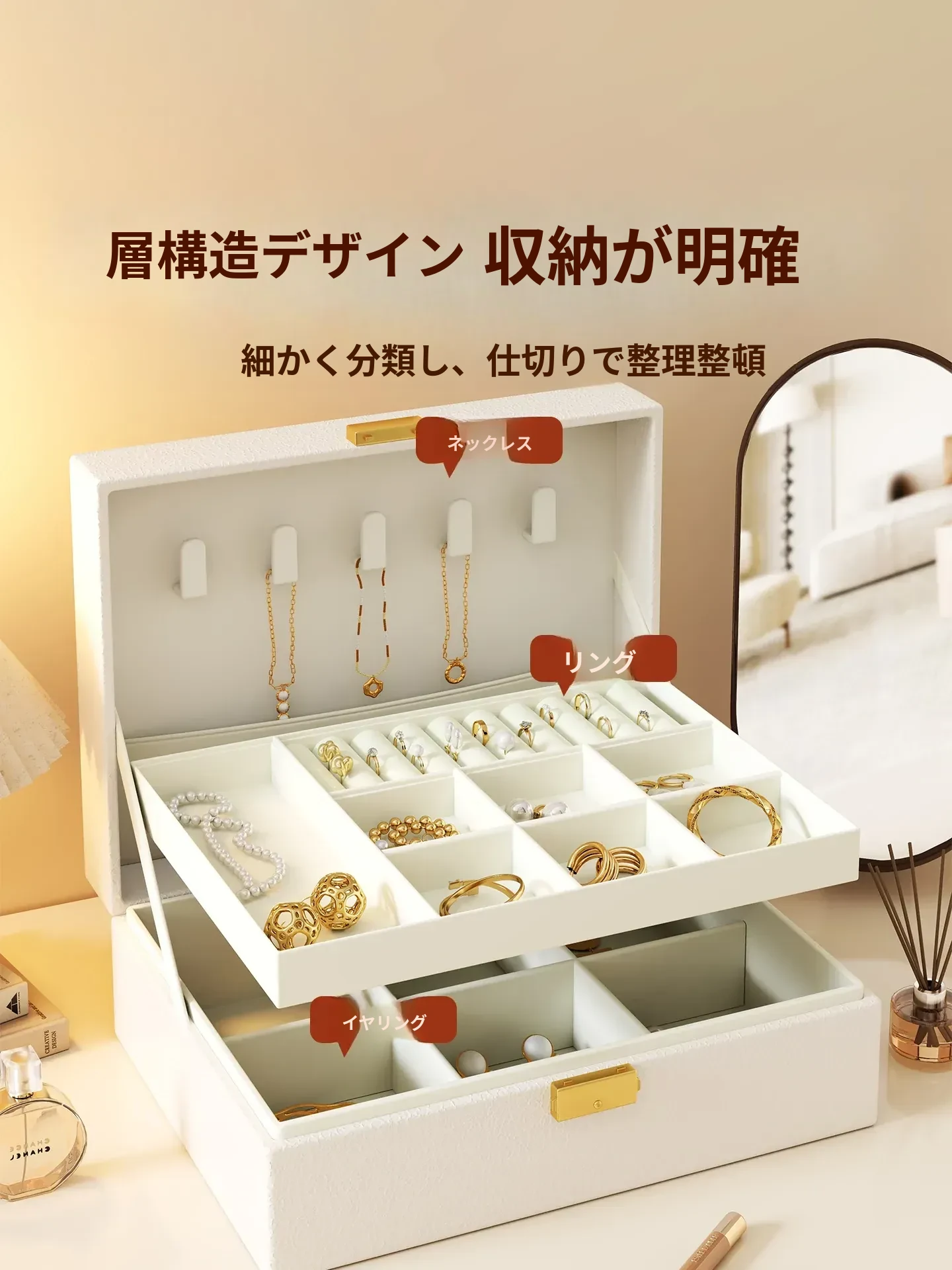 クリーム風ジュエリーボックス収納ボックス - 高級感あふれる多層式デザインで、ネックレスやピアス、イヤリングなどのアクセサリーを美しく保管。酸化防止機能付きで、大切な宝石をいつまでも輝かせます!