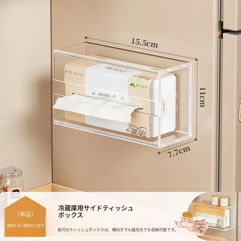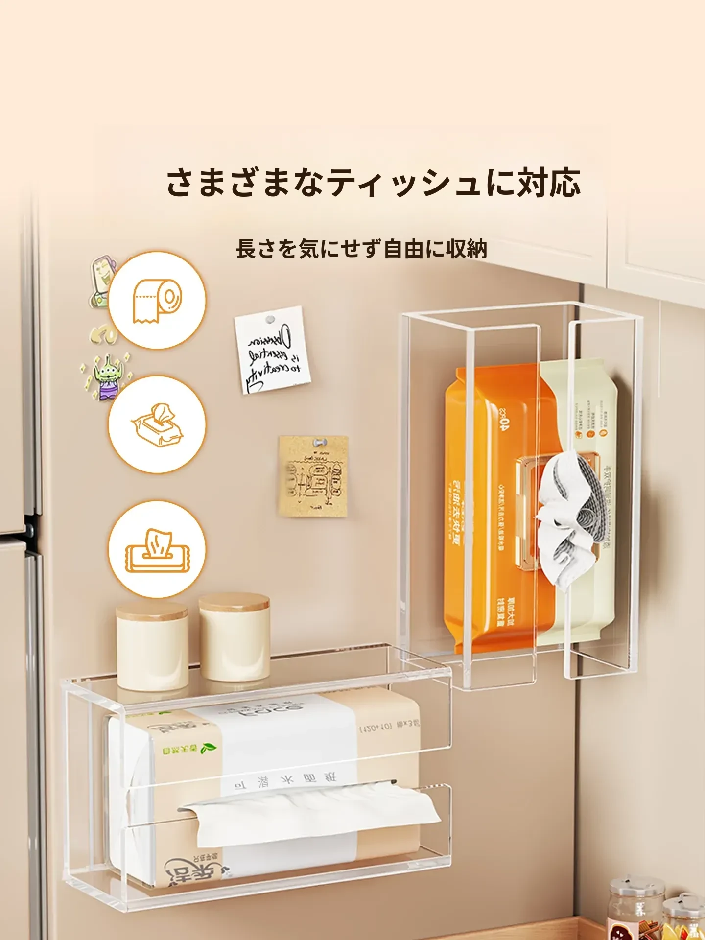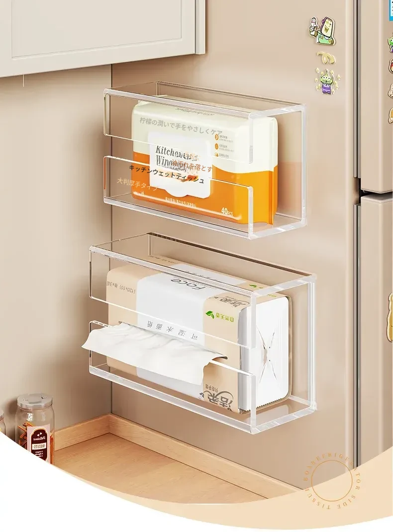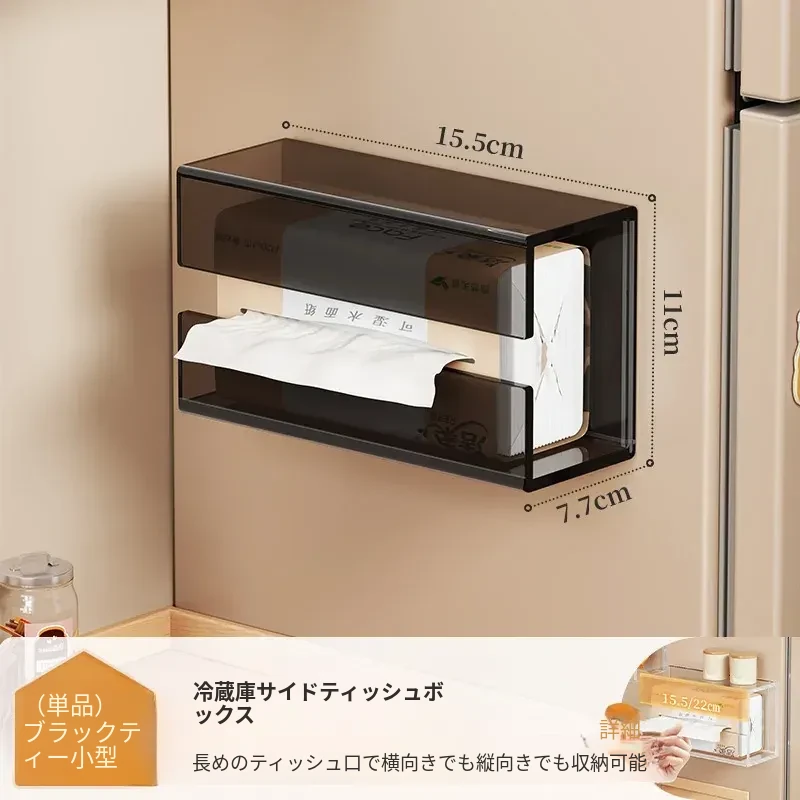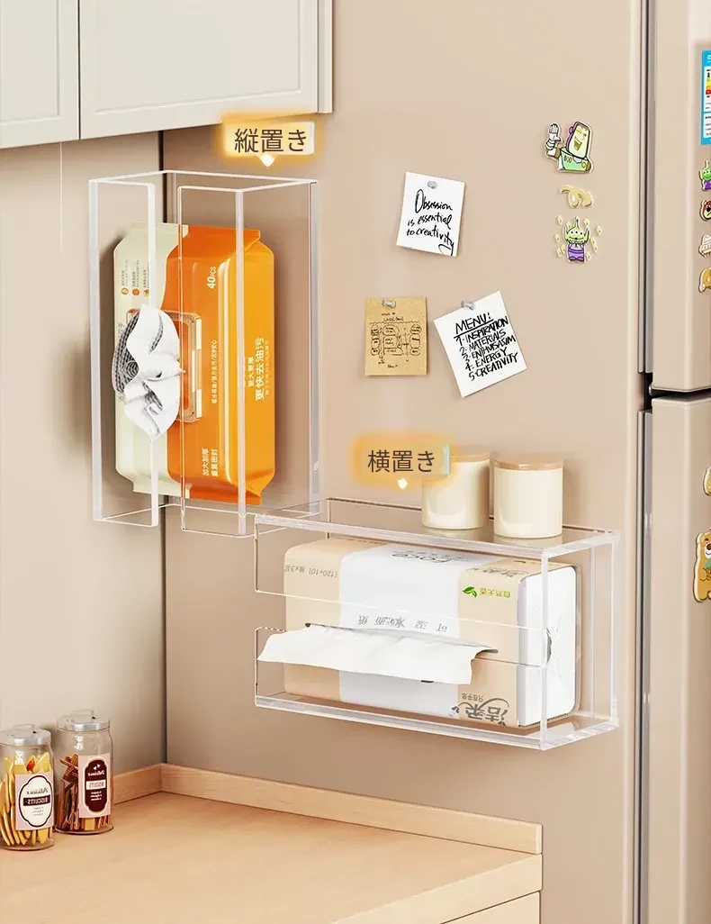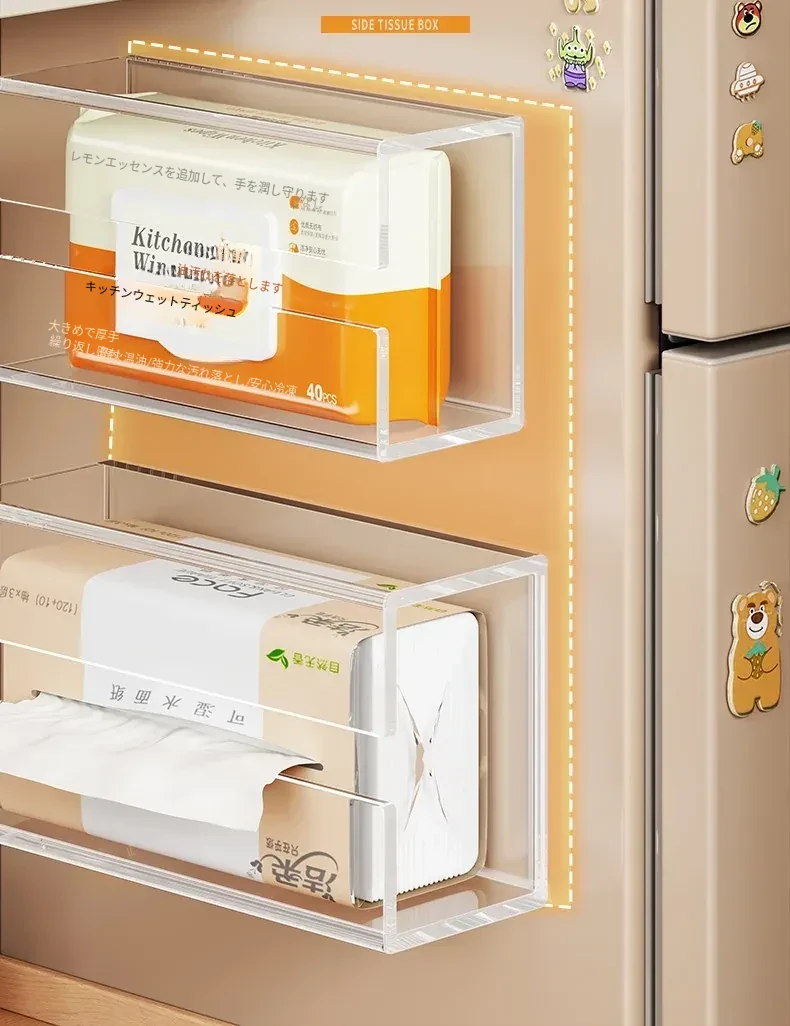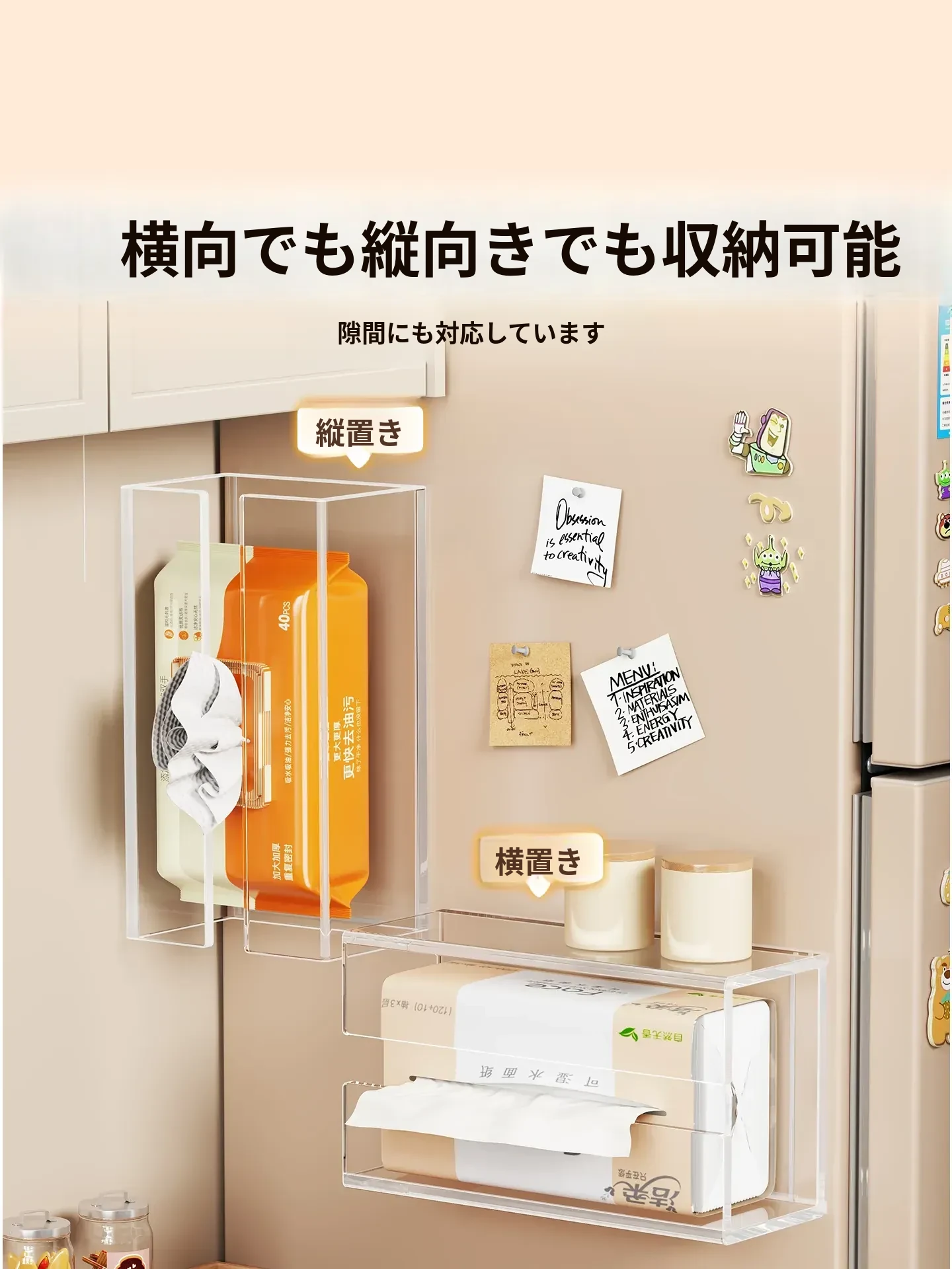 壁掛け式ティッシュボックス - 冷蔵庫サイドに取り付け簡単!キッチンのスペースを有効活用し、濡れティッシュやトイレットペーパーをスッキリ収納。スタイリッシュで便利な収納アイテム!