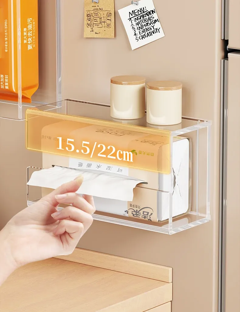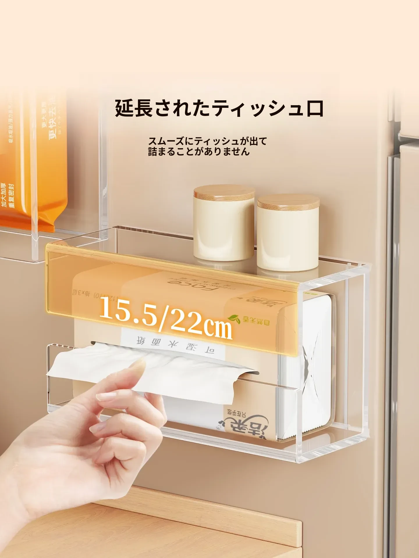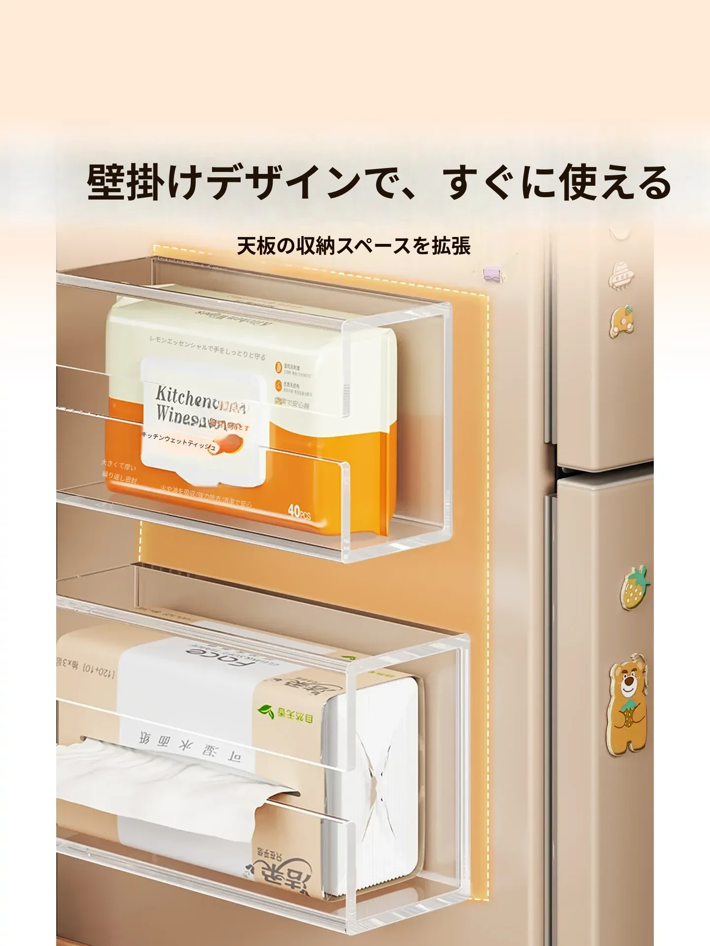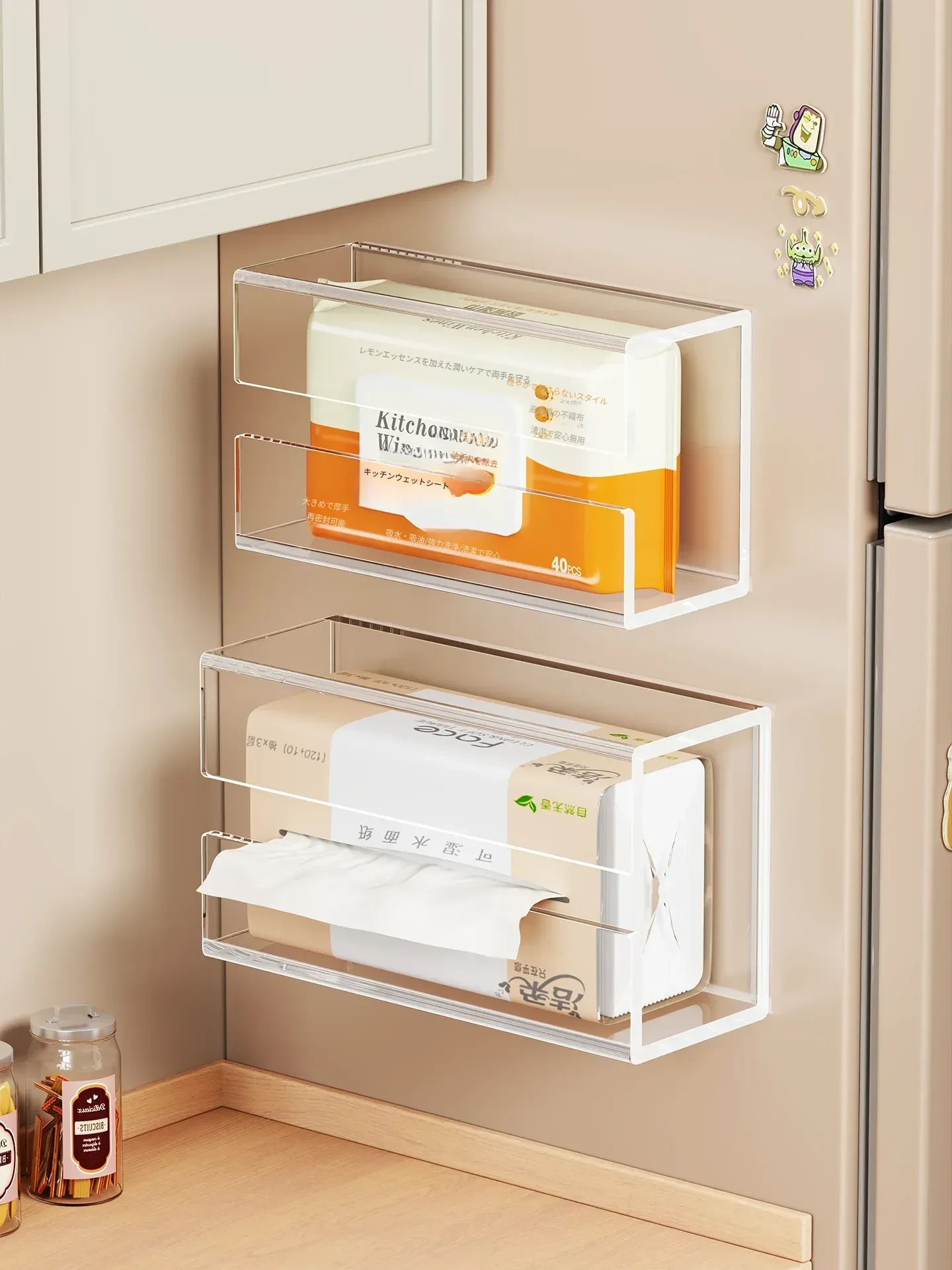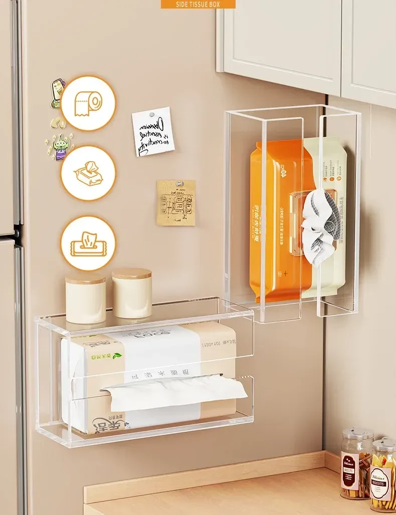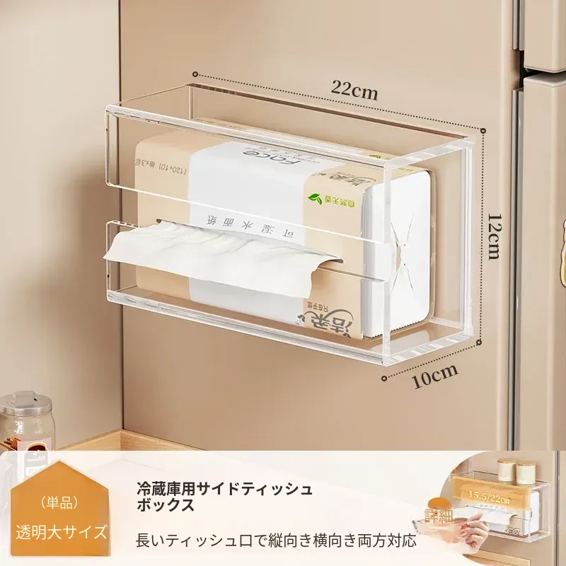 壁掛け式ティッシュボックス - 冷蔵庫サイドに取り付け簡単!キッチンのスペースを有効活用し、濡れティッシュやトイレットペーパーをスッキリ収納。スタイリッシュで便利な収納アイテム!