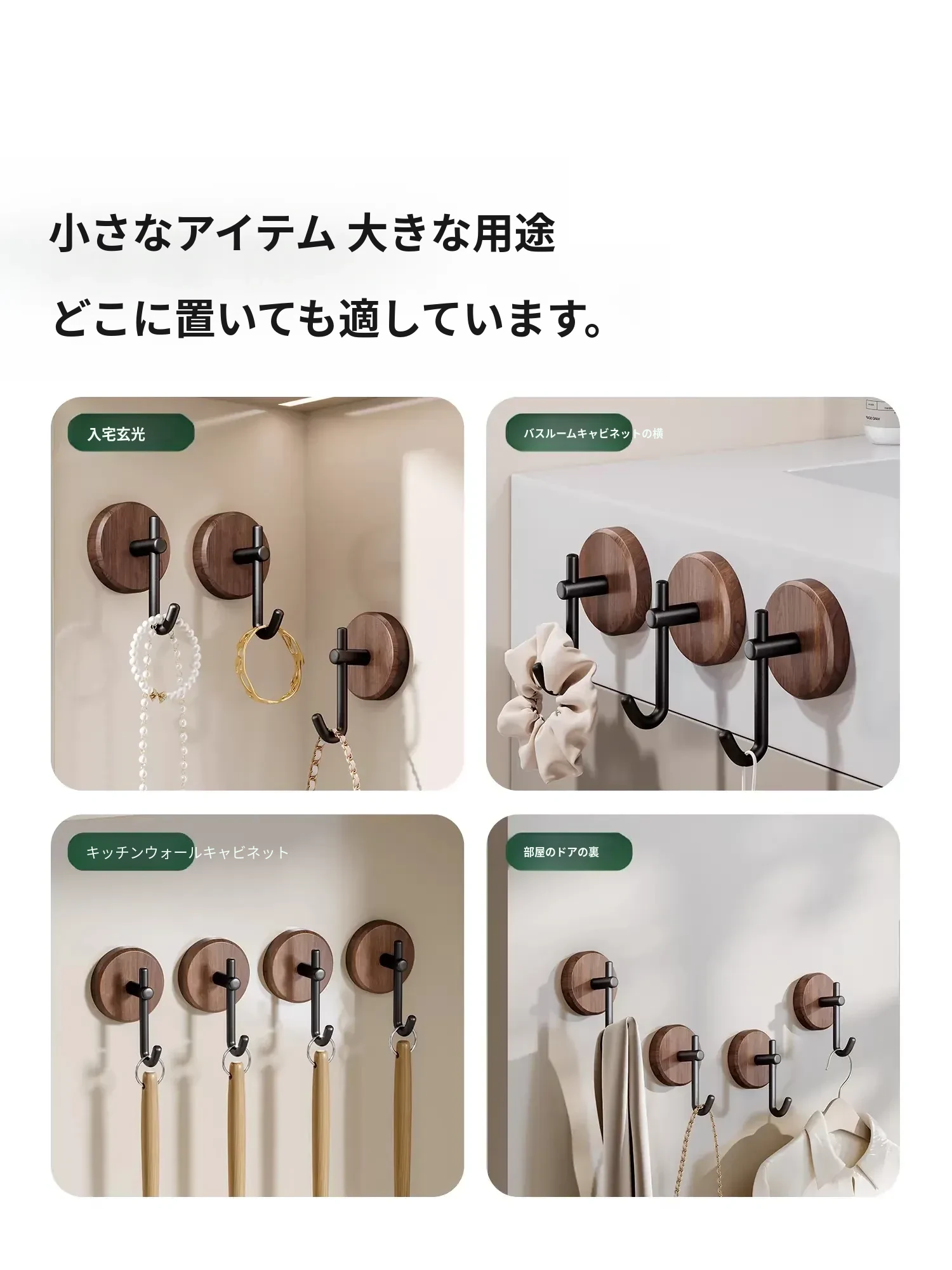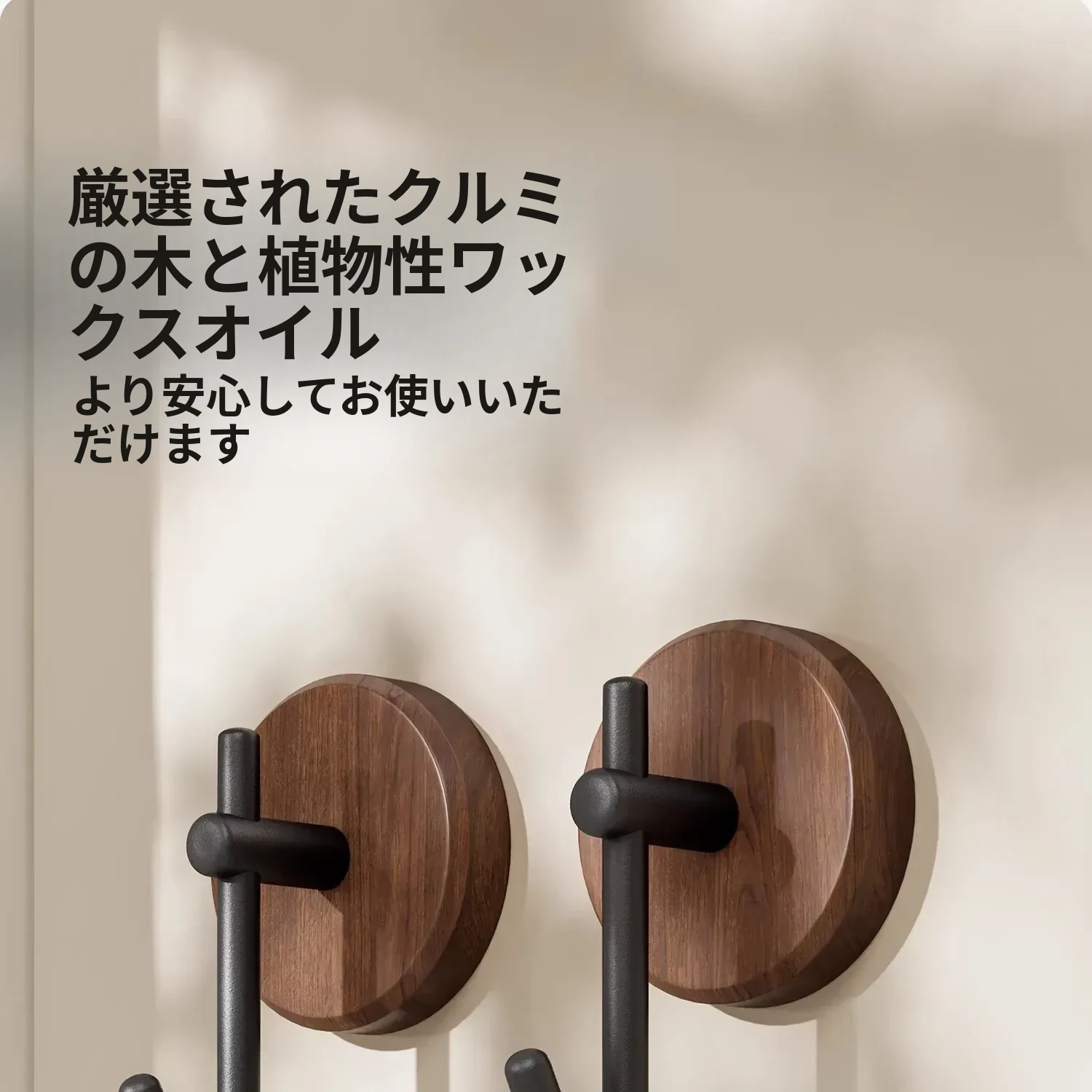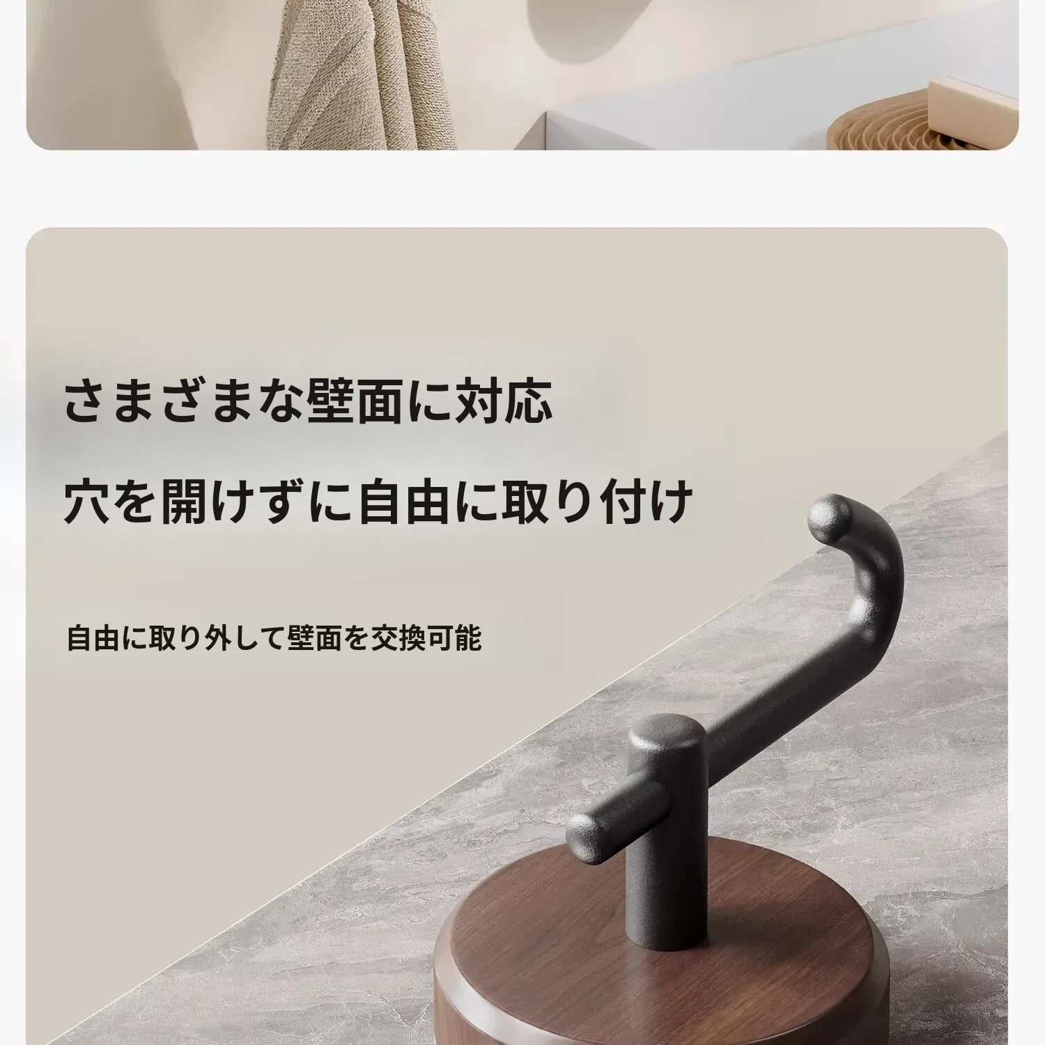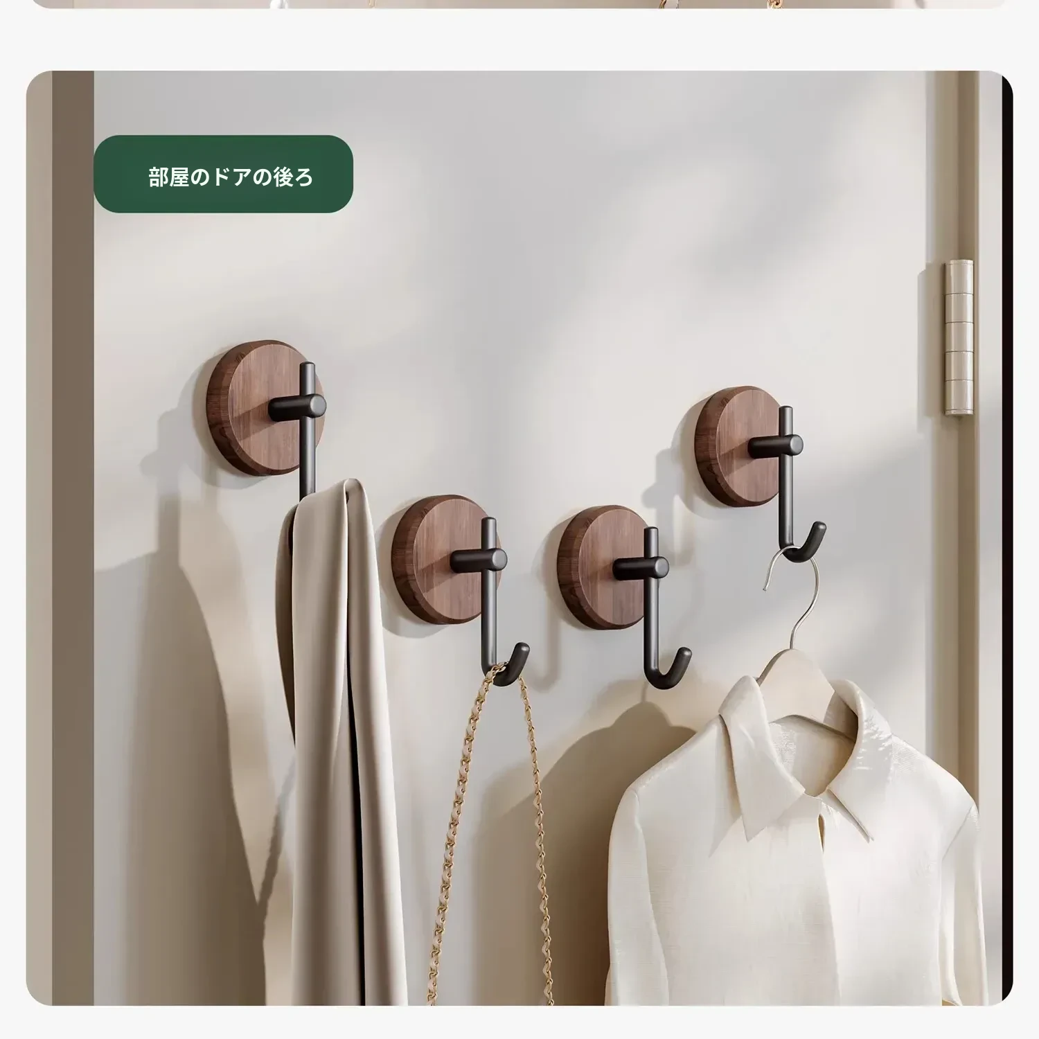 ウォールナット製バスルームフック - 穴あけ不要・強力耐荷重・目立たない!トイレのドア裏や壁に最適な高級感あふれるタオル掛け粘着フック。清潔感とスタイリッシュさを両立!