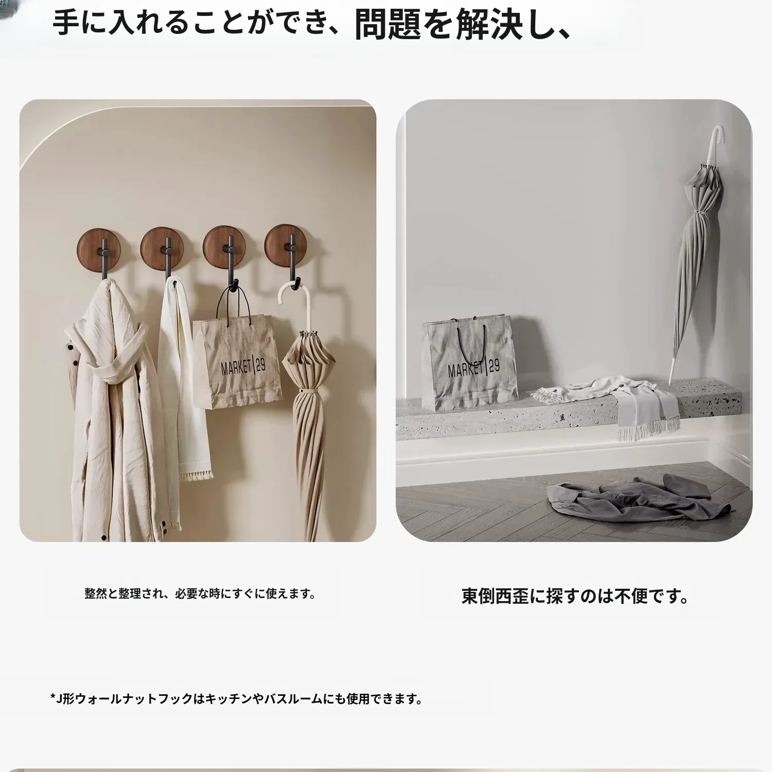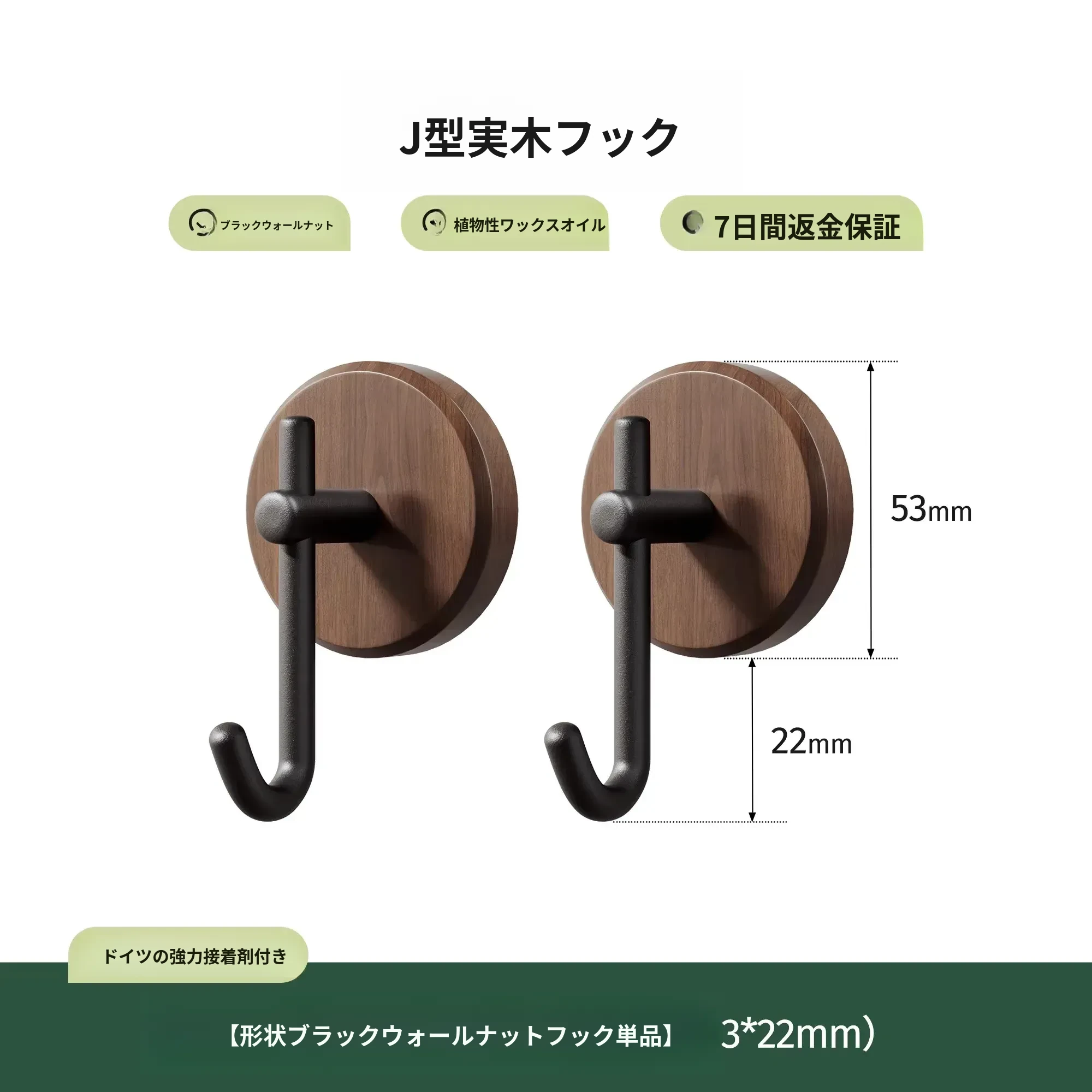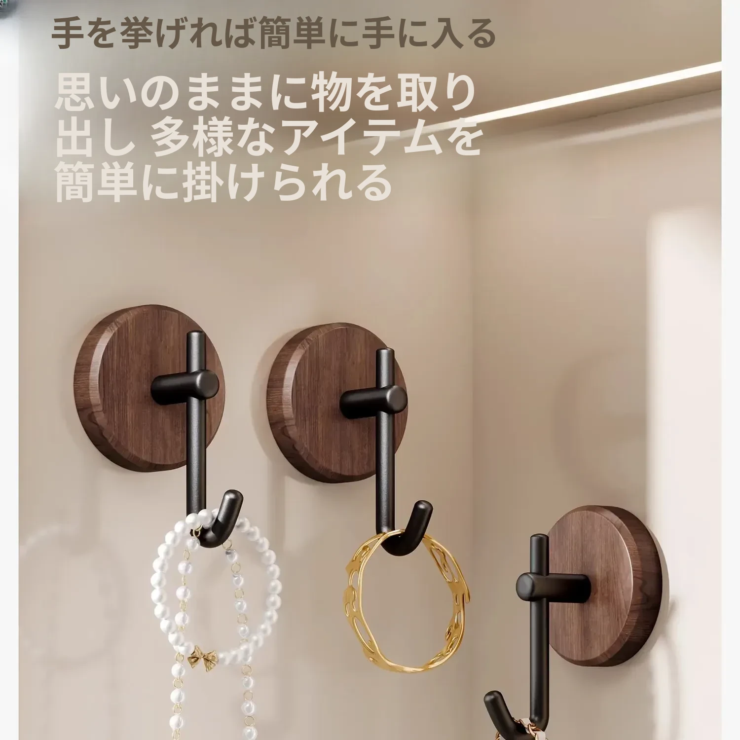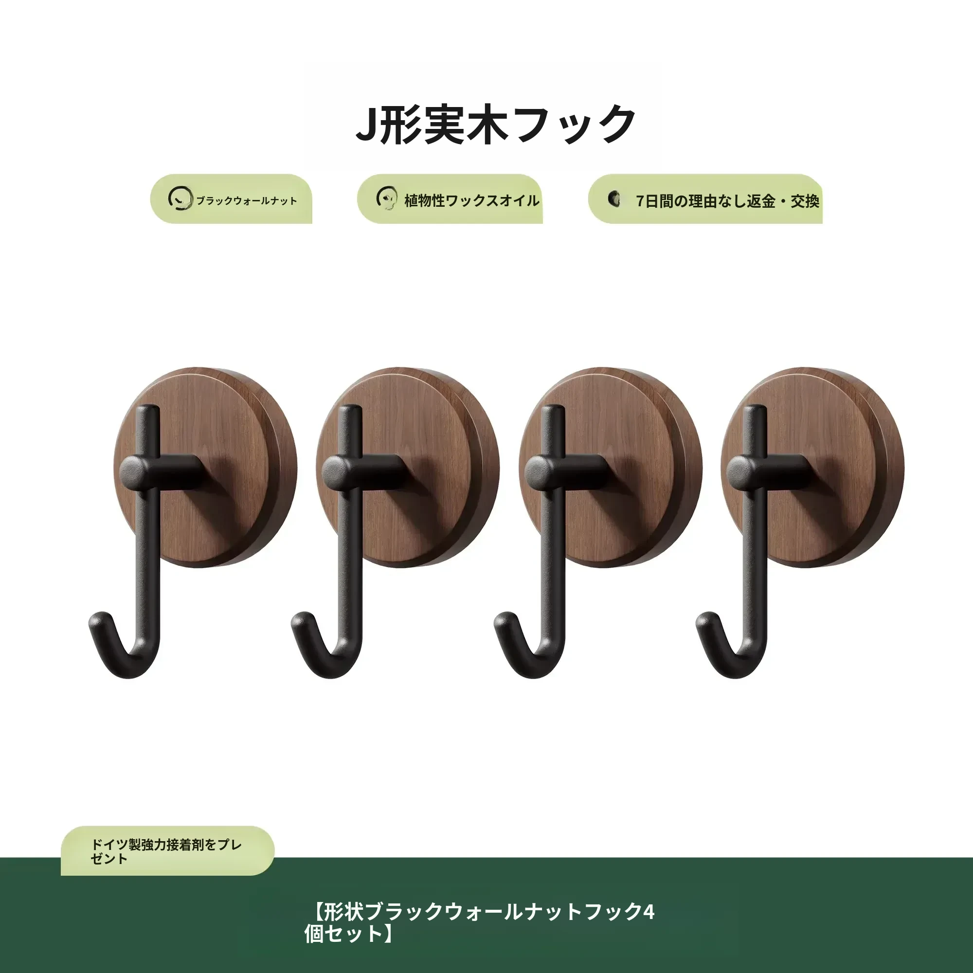 ウォールナット製バスルームフック - 穴あけ不要・強力耐荷重・目立たない!トイレのドア裏や壁に最適な高級感あふれるタオル掛け粘着フック。清潔感とスタイリッシュさを両立!