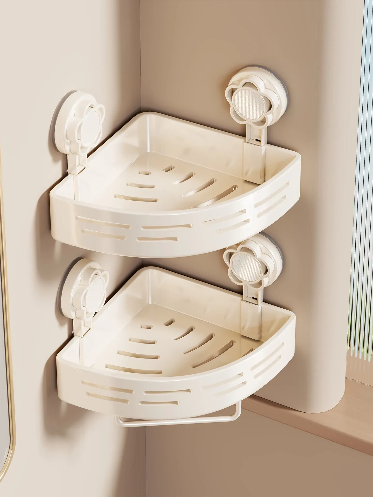 トイレ用吸盤式収納ラック|バスルームに最適な壁掛け三角バスケット|洗面台や化粧台にフィットする便利でおしゃれな収納アイテム!整理整頓を簡単に!