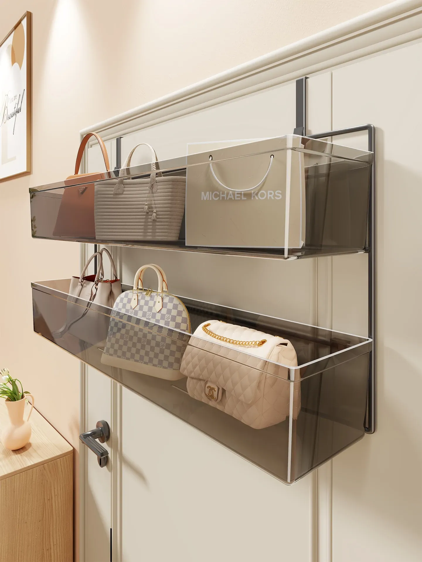 バッグ収納の神アイテム!透明収納ラック - ドア裏にぴったりなバッグ収納スタンド、家庭でのバッグ整理を簡単に!スッキリとした空間を実現します。