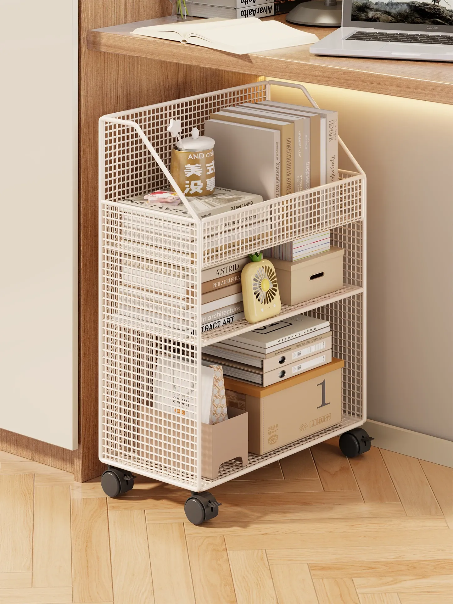 オフィスデスク下の便利な収納ラック!移動可能な多層キャビネットで、お茶やスナック、書類をすっきり整理。キャスター付きで簡単に移動できる雑貨収納です!