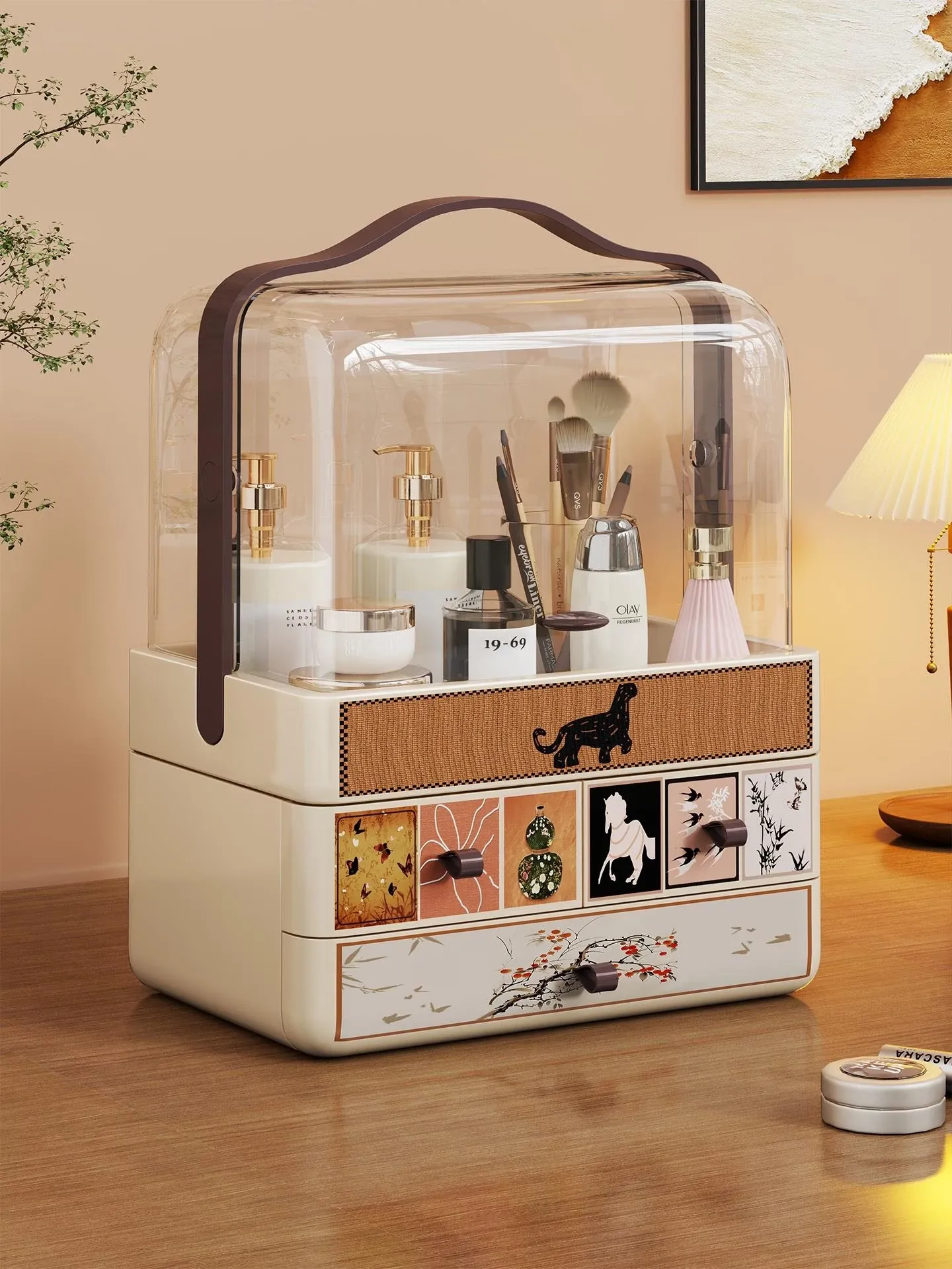 大容量の化粧品収納ボックス - メイクアップテーブル用のスタイリッシュなデザイン!口紅や香水、化粧ブラシもすっきり整理できる多機能収納ボックス。あなたのビューティーアイテムを美しく整頓し、毎日のメイクをもっと楽しく!