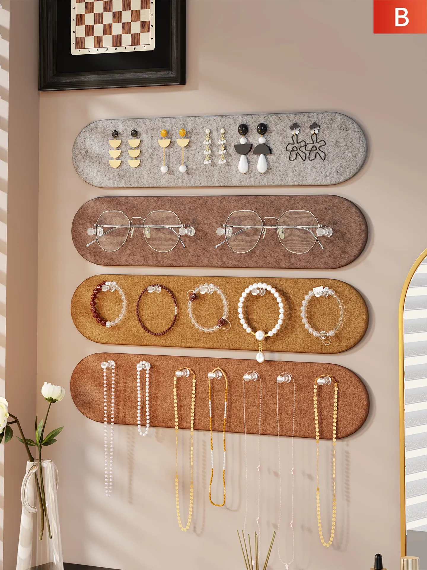 壁掛け式ジュエリーフェルトボード - おしゃれなネックレスやブレスレットのディスプレイ&収納に最適!壁面を美しく彩る多機能ハンガー。あなたの大切なアクセサリーをスタイリッシュに見せましょう!