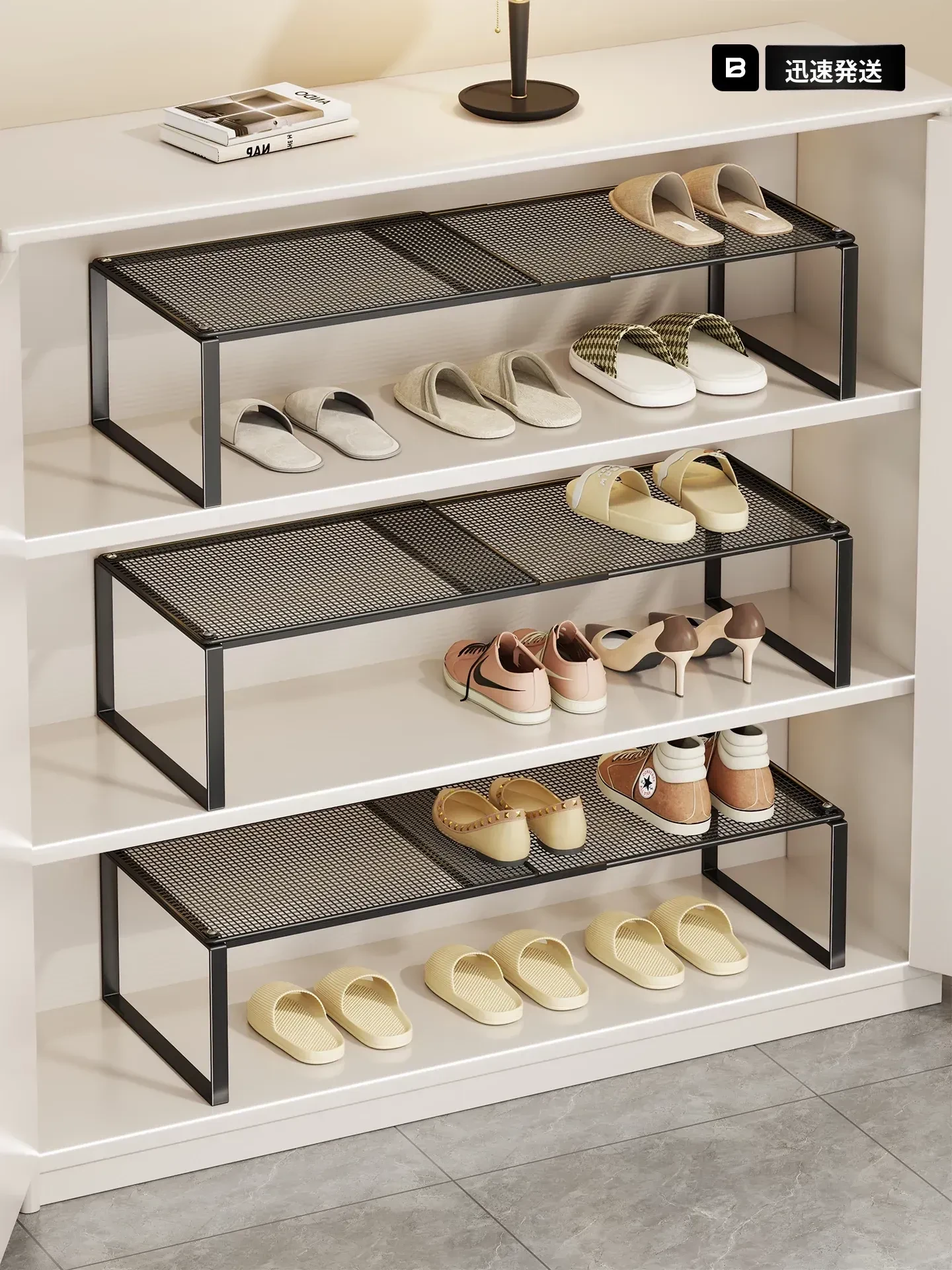 伸縮式シューズラック – 家庭用の多層収納!靴や衣類をすっきり整頓できる、寝室やクローゼットに最適な仕切り付きの便利アイテムです。収納力抜群で使い勝手も抜群!